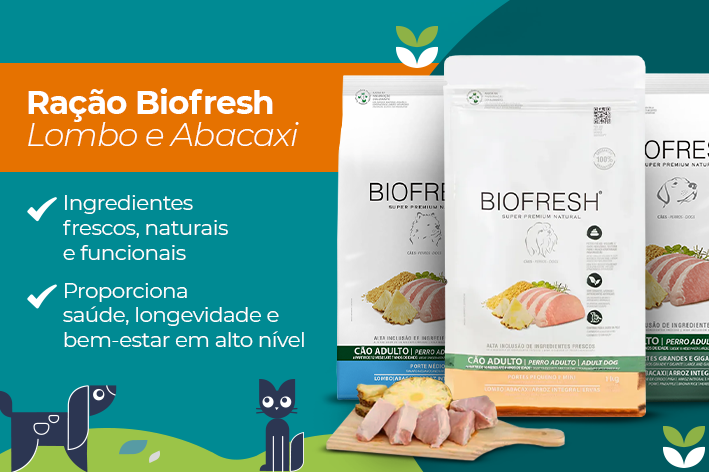 Rico em ômegas 3 e 6, além de vitaminas como a biotina, Biofresh Lombo & Abacaxi contribui com a saúde da pele e brilho da pelagem.