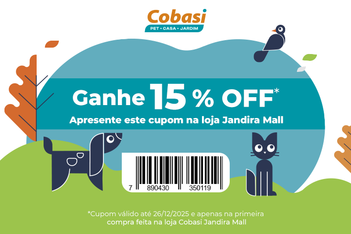 E tem mais: para celebrar essa inauguração especial, preparamos 15% de desconto na sua primeira compra na Cobasi Jandira Mall.