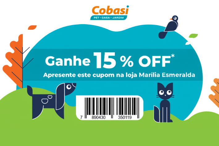 15% de desconto na sua primeira compra na Cobasi Marília Esmeralda.