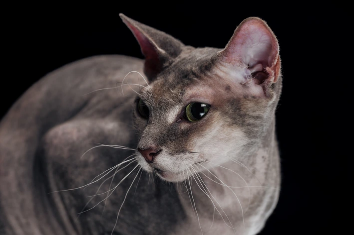Criado na Rússia a partir do cruzamento entre as raças Donskoy e Oriental de Pelo Curto, o Peterbald é um felino sociável conhecido como gato pelado russo.