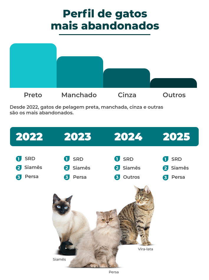 Entre os felinos, o padrão também se mantém ao longo dos anos. A maioria dos animais abandonados é sem raça definida, com ocorrências das raças:
